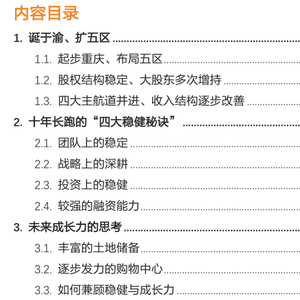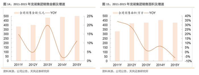 2011-2015年(深耕三大区域,并持续进入华南区域、华中区域):2011年公司开启“优土储、强运营、控成本、持商业、精团队”为关键词的战略转型,期间公司创始人吴亚军女士辞去集团CEO一职,并由邵明晓先生接任该职位,加速了公司以职业经理人为主的团队管理模式。战略转型期间,公司虽持续拓展新区域,进入华南、华中区域,但短期的增幅不再成为公司的核心关注点,而是将更多的心思注入于商业地产的沉淀、多元业务的探索。相比于这期间内开始大幅加杠杆追求规模的房企而言,龙湖集团的谨慎及长远性战略选择使得公司在销售排名榜上的不进则退。