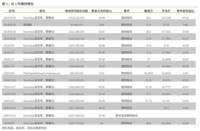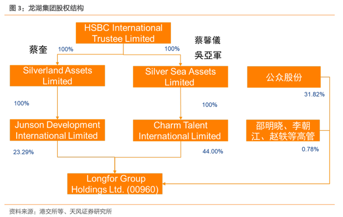 公司股权结构稳定:龙湖集团创办人吴氏(吴亚军女士)、蔡氏(蔡奎先生)早期将集团股权分别转让吴氏家族信托(Silver Sea)及蔡氏家族信托(Silverland),HSBC International Trustee为两个信托的受托人。两家信托初期分别持有股权比例为46.9%、31.3%,合计持有78.2%。截止2020年6月,根据联交所披露权益数据显示,目前吴氏家族信托、蔡氏家族信托分别持有公司权益44.00%、23.29%,合计持有67.29%,持股结构较为稳定。此外,公司高管,如邵明晓先生等合计持有公司股权0.78%。