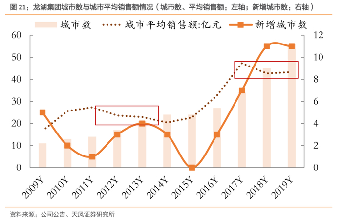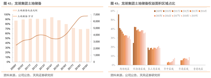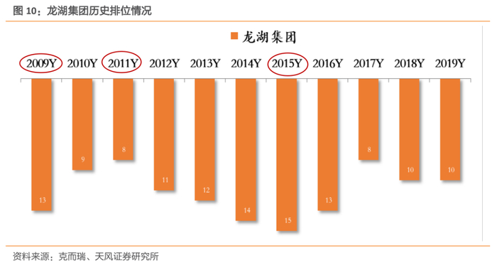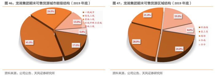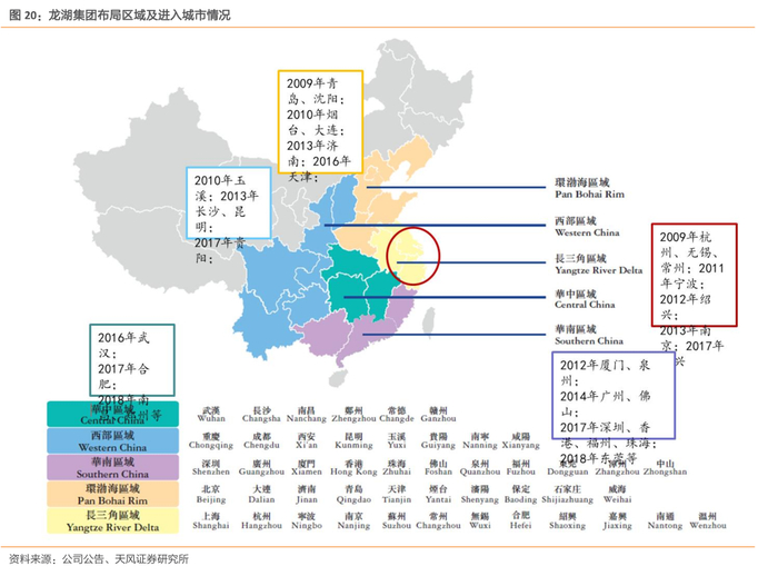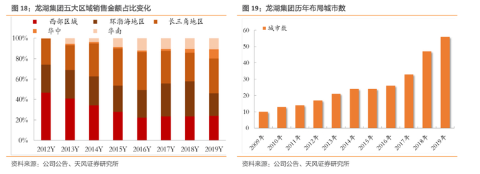 2016年至今(五大区域基础上深耕并适度下沉城市布局):2015年启动的新一轮地产行情,逐步从一二线传导至三四线城市;这一时期内,公司在坚持一二线城市的区域聚焦基础上,开启了城市圈内的挖掘机会并适度下沉了布局;新进城市的销售也为公司带来销售规模上的扩张;这一阶段内公司排名重回TOP10。区别于传统TOP10房企,龙湖集团至2019年末总布局城市数不足60城,是TOP10房企中布局城市数量最少的企业之一。
