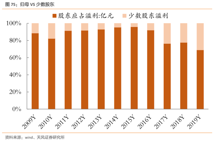 截止2019年末,龙湖集团归母净利率为18.95%,较上年同期收缩约1.89pct;时间轴上看,龙湖集团净利率在16年达到阶段高点后开始连续收缩,主要源于这一段期间内提升的销售费及管理费压缩了净利率空间。2019年虽然三费略有收缩,但归母净利率仍较上年同期下滑约1.89pct,主要源于少数股东权益的变动。与样本组比较看,虽然近两年净利率收缩但其仍维持高于样本组的净利率水平。