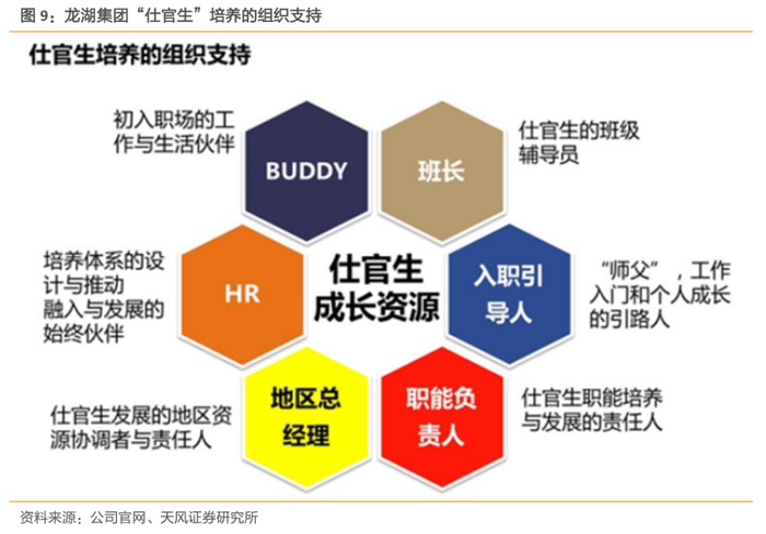而最为业内认可、响亮的便是仕官生计划,仕官生起源于04年,彼时公司在重庆大展身手,但仍有不足:1)长期偏安一隅,造成龙湖中高层管理团队的全国化视野不足;2)项目运作多是单个进行,系统性思考的能力相对欠缺。这些不足对于目标是全国性地产集团的龙湖而言,极为不利;由此仕官生计划应势而生。仕官生的起源便是为了促成一个龙湖内部造血机制的形成(仕官生定位于精英招聘,其培养理念是“懂专业技术的管理者,而不是纯粹的管理者”;培养目标决定了对应届生的高标准、严要求;仕官生的招聘是为公司选拔人才,而非为某个岗位招聘),从第一届应届生至今已持续十五年,是招聘主力军,一般每年可到2-3百人的规模。