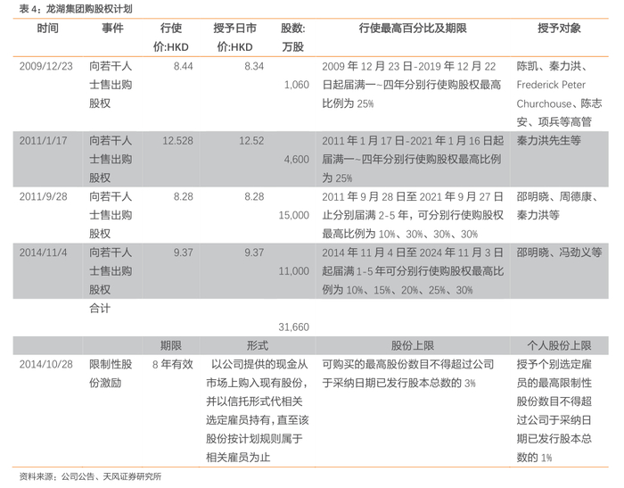 1)2009年上市后不久便推出购股权计划于若干资格人士,其中购股权计划在09-14年间购股权计划共推出4次;总计授予股份数量31660万股,占当前股本数5.29%。其中截止2019年末,已授出未行使购股权股份数目6626.25万股,占当前股本数1.11%。