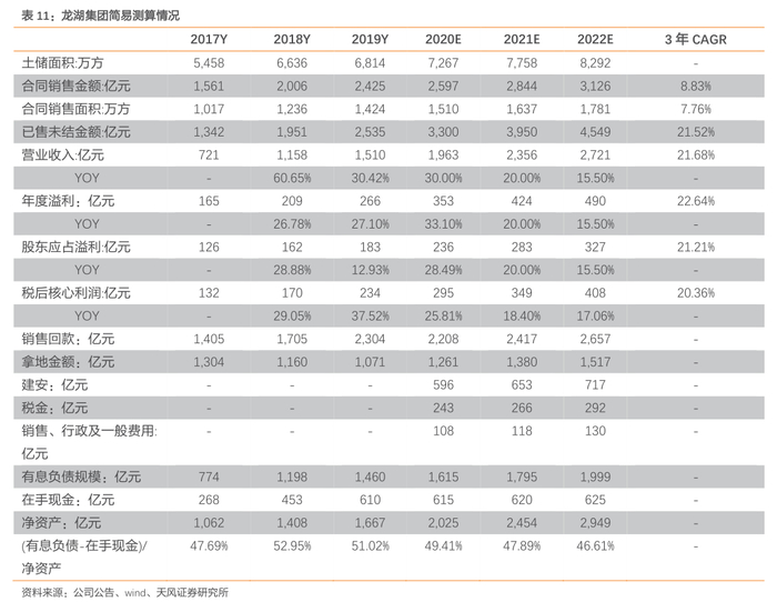 3)兼顾稳健与成长力的现金回款力与资产负债表基础:我们通过建立的简易模型测算结果显示,龙湖集团营业收入、年度溢利、股东应占溢利、税后核心利润的三年CAGR分别为21.68%、22.64%、21.21%、20.36%;且在这个复合增速下公司(有息负债-现金)/净资产保持较低水平。我们认为,龙湖集团在未来仍具备兼顾稳健与成长的特点,且由于公司本身所具备的低融资、强管理、稳投资、稳团队等特点,在行业周期运转中,能够更好的穿越周期。