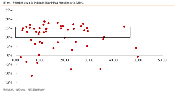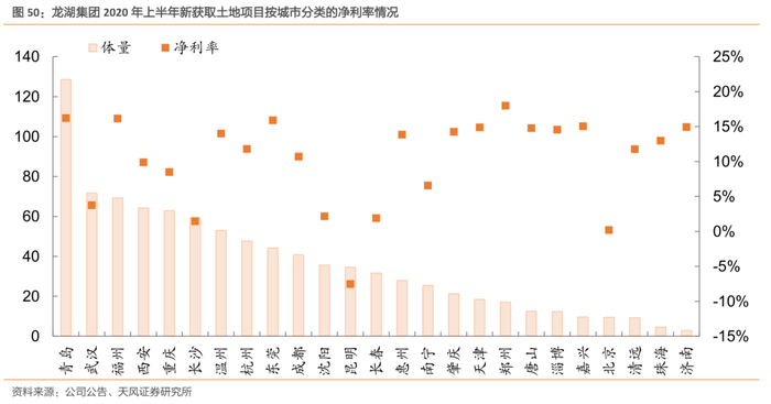公司土地储备数量充足(可满足滚动开发3.83年),土储的质量也相对优异。质量上的优异除却地理区域上的优质——布局城市为核心一二线及环城市圈的强三线外,也体现在项目的质量上。我们单独拎出公司2020年上半年获取的土地项目测算其项目层面静态净利率的情况;2020年上半年龙湖集团新增土储项目体量大部分集中于10-20万方之间,超过30万方的项目较少,在资金成本4.54%的假设条件下,我们测算各新增项目静态净利率的变动可发现,大部分项目净利率在10%-15%的区间内。若按照城市总体量与净利率分布看,大部分城市整体静态净利率维持在10%-15%的区间内,极个别城市为低于5%的净利率。