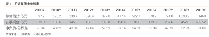 除却有质有量的土地储备外,龙湖集团已售未结资源相比于当下的物业发展收入而言,也是较为丰厚的。截止2019年末,龙湖集团已售未确认面积1500万方,YOY+27.77%;对应已售未结金额2535亿元,YOY+29.93%;已售未结均价16900元/平米。以已售未结金额/营业收入计算业绩锁定率,龙湖集团业绩锁定率的高点在2010年,此后由于战略转型,重心加上了“持商业”的选择,公司业绩锁定率下滑较为明显,低点出现于战略转型的第四年-2014年,2015年起该比率逐步提高,截止2019年末,公司已售未确认/营收为167.85%,已售未确认/物业发展收入为180.06%,业绩锁定率较高,对于未来业绩有较好的保障度。