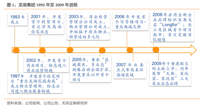 龙湖集团(0960.HK)前身为重庆佳辰经济文化促进有限公司,成立于1993年;1997年公司开发首个住宅项目“重庆龙湖花园南苑”,同年成立物业管理部,标志公司进入物业服务领域;01年公司开发首个别墅项目,首次涉及高端住宅业态;02年开发首个商业项目,标志起进入商业运营领域;03年随着北城天街购物中心的开业,商业经营管理分公司成立,同时物业管理公司成立并接受商业物业,经营逐步迈向多元化;05年公司秉承“区域聚焦、多业态”的战略,启动全国扩张并开发了重庆以外首个项目;07年公司业务正式布局至环渤海区域;08年拓展至长三角区域,同年销售首次破百亿;09年11月,公司于香港联交所主板挂牌上市,正式进入资本市场。