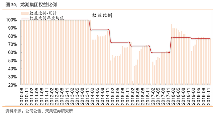 从权益比例的角度看,09-13年这一期间内,公司基本以100%权益比例持有土地项目,合作开发开始于2014年,并于2017年达到合作开发的高度阶段。18年起,公司开始提高权益比例的水平,截止2019年末,权益比例由低点60.46%提升至77%,权益比提升较为明显。