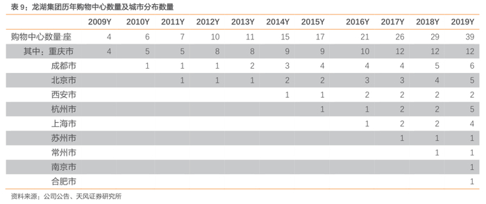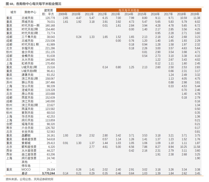 3)市均购物中心数量提升,11年起开始持商业的战略转型下,市均购物中心数由2.3座逐步提升到2019年的3.9座,走出去与扎根深耕效果明显;其中单城市布局购物中心数量不低于5座的由一开始的重庆(1城)提升到4城 [ 重庆(12座)、成都(6座)、北京(6座)、杭州(5座)]。购物中心单座平均租金收入由11年的0.6亿元逐步提升到2019年的1.2亿元;对应的座均面积由11年的6.3万方逐步提升到2019年的近10万方体量。