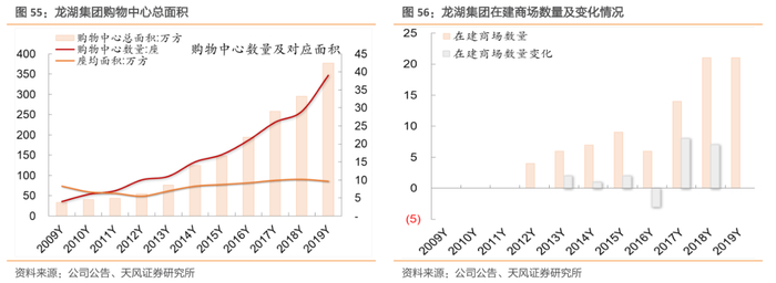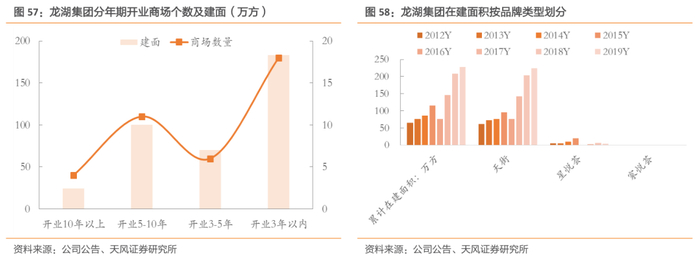 分期看开业商场个数及建面,其中开业10年以上的商场数量4座,对应建面24万方,座均面6万方;开业5-10年的商场约11座,对应建面100万方,座均面9.09万方;开业3-5年的商场6座,对应建面70万方,座均面11.67万方;开业3年以内的商场18座,对应建面183万方,座均面10.17万方。显然,较早开业的商场平均面积较低,体量较小;整体商场平均体量的上限或为11-12万方,与龙湖产品对应的体量基本一致。而龙湖集团商场真正发力的阶段则为近三年开始(对应提估值的开启)。