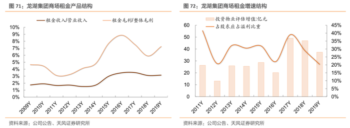 对于布局商业地产的公司而言,商业一般采用公允价值计量投资性房地产,每年除了商业租金对于利润的提升外,自持物业的升值也能带来公允价值变动收益,进而增厚公司账面业绩。通过公允价值评估增值/股东应占溢利的权重看,投资物业评估增值占股东应占溢利比重波动较大,2011年为比例高点(41.55%),近两年逐步下滑,从近40%的比重下滑至2019年末的20.34%。