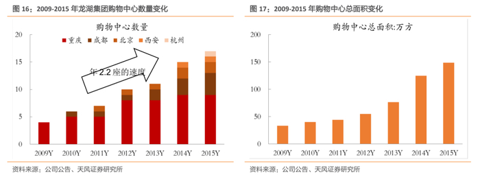 这一阶段,龙湖集团销售规模虽无明显提升(2013-2015年销售规模近乎无增长),但其购物中心数量相较09年有较为明显的提升——由09年的4座(且仅位于重庆市)拓展至15年的17座,其中重庆增至9座,成都、北京、西安、杭州分别为4座、2座、1座、1座;购物中心总面积由09年的33.2万方提升至15年的148.6万方,增长约3.48X。