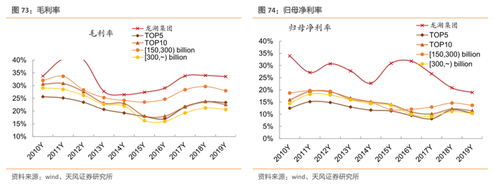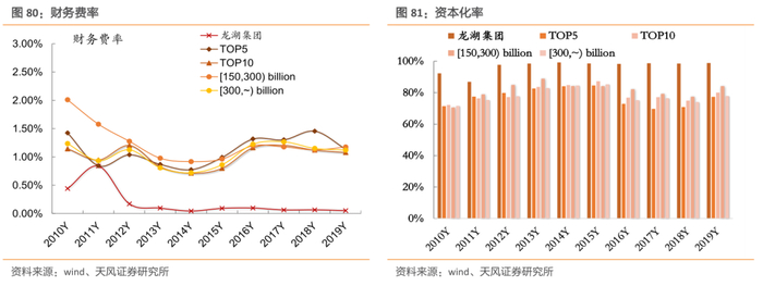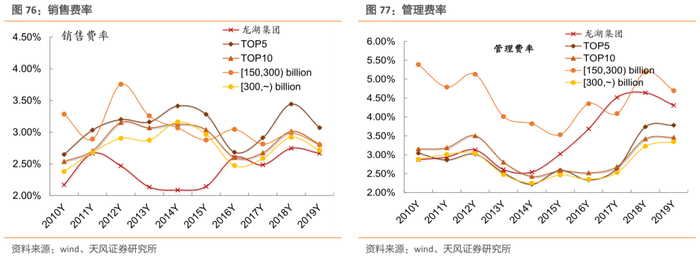 从时间轴上看,样本组销售费用/销售金额自其阶段高点后至2018年均有不同程度的收缩,但龙湖集团销售费用/销售金额在17年为阶段低点,而18年则提升明显,或于2018年这一期间内加强营销推广等相关。2019年龙湖集团销售费用/销售金额的比重较18年略微提升0.07pct,而样本组的表现则相对稳定,甚至于[150,300)billion样本组在19年销售费用/销售金额收缩约0.11pct。而管理费用/销售金额的比例中,除却[150,300)billion样本组,其余样本组的波动幅度较低,且管理费用/销售金额比重也显著低于龙湖集团及[150,300)billion,猜测或因[150,300)billion样本组对于规模的诉求推动其更愿意高薪聘请或留住优秀的管理人才。