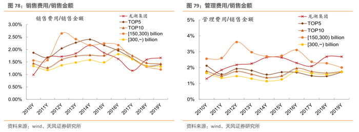 考虑到房企报表中的期限不匹配现象,我们根据销售费用/销售金额、管理费用/销售金额作为另一衡量指标对费用率做参考评价。