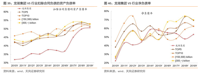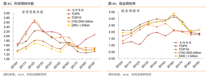 截止2019年末,龙湖集团ROE为20.88%,较上年同期收缩0.45pct;时间轴上看,龙湖集团ROE在2012-2015年趋势性下滑,这一阶段主要源于净利率的下滑、资产负债率的逐步下滑;16年起龙湖集团资产负债率、ROE均有逐步提升的趋势。与样本组的比较看,样本组ROE在2012-2015年区间内下滑趋势明显,并于16-17年不同时间点、不同程度的上行;不同样本组当前ROE的表现而言,龙湖集团ROE相对优势较弱,略高于[150,300)billion样本组的表现,但相比其他。