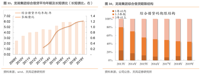 合理的期限结构。从综合借贷的期限结构看,2013年公司综合借贷期限以1-3年期为主,占比约56%;2014年起,公司逐步调整期限结构,加大3年以上的借贷期限的融资比例;至2019年末,3年期以上的借贷比例达到近年来高点,约占比55%(较上年末略提升1pct),其次为1-3年期的占比约36%(较上年末持平)。综合借贷期限结构的调整也使得公司平均综合借贷年期逐步提升,长短债比逐步提升至1.22(3年期以上/(1年期以内+1-3年期)),期限结构合理。