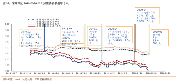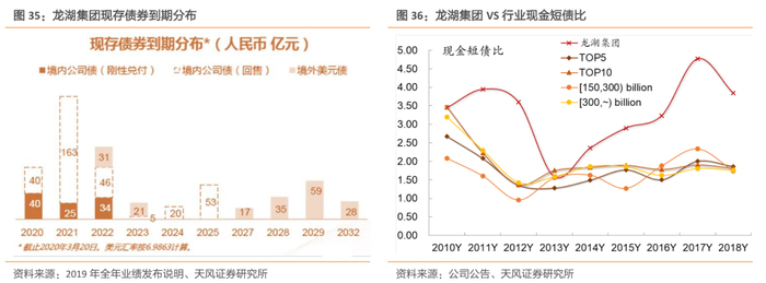 龙湖集团虽为民企,但具备较强的融资优势。根据公司年报披露的历年融资加权平均利率的水平,2010-2019年以来,公司融资成本利率的高点在2012年,此后融资成本有微小的调整,2015年公司融资成本大幅下滑66BP至5.74%,2016年收缩82BP至4.92%。在融资环境逐步收紧的2018年,公司仍能维持较为稳定的融资成本,足见其优秀的融资能力。截止2019年末,公司平均融资成本4.54%,较2018年末微幅收缩0.01pct。
