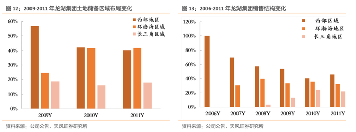 2009-2010年(扎根西部区域,不断拓展长三角、环渤海区域):公司起步于重庆,上市初期布局主要集中于西部区域,为此公司在坚持“区域聚焦”战略基础上,不断增加“环渤海、长三角”城市布局,这一期间内战略性进入杭州、青岛、无锡、常州、沈阳、烟台、大连等环渤海、长三角区域城市,新区域的拓展使得集团土地储备结构平衡化,销售规模获得充足支撑,2010-2011年规模排行榜的提升主要受益于新进城市的贡献。