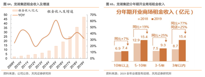 从租金收入角度看,10年以上的开业商场租金表现稳定。截止2019年末,公司商业租金达到47.5亿元,YOY+32.3%,其中同店增长19%。分年期开业商场看租金收入表现看,开业3年以内及5-10年的商场租金占比最高,3-5年次之;此外租金收入同比增速随着开业年期的增长而递减,开业3年以内的商场租金同比增速最高为77%,其次为3-5年开业商场,增速为25%;开业10年以上的商场同比增速相对稳定,在7%的范围内。从租金的产品结构看,天街为主要租金贡献主体,占比约93.3%,较上年同期提升0.6pct,其次为星悦荟,占比约5.9%(较上年同期收缩0.4pct),家悦荟最低,不足1%的租金贡献比重,与各类产品开业数量、开业面积等有较为直接的关系。从商场租金增速的结构看,2019年末公司整体租金增速32.3%,较上年同期收缩9.5pct;天街、星悦荟、家悦荟三者在2019年末的租金增速分别为32.8%、23%、1.2%,较上年同期分别收缩11.8pct、提升3.5pct、提升1.2pct;星悦荟租金增速近两年相对稳定,而家悦荟仅一座商场贡献来源,因此租金收入增速浮动较为平稳。