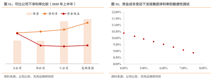 选取个别行业内企业上半年新增项目净利率的情况作比较,可发现,在资金成本相近的样本中,龙湖集团具备较高的静态净利率,表明龙湖集团较强的投资管控能力。此外,我们根据龙湖集团资金成本逐步变动的情况做了净利率的敏感性测试,即使到可比公司较高资金成本的水平,龙湖集团仍可取得不输于行业水平的项目静态净利率,我们认为这与公司所布局的城市能级、拓展能力等息息相关。