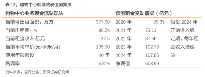以现金流贴现方式计算,按照公司未来对于购物中心的开业计划及当前购物中心的发展情况看,分别假设出租率租金收入在稳定期年复合增长率为5%,商业运营的净利率假设为25%,在此假设下,可测算购物中心业务现金流贴现净值为603.99亿元。