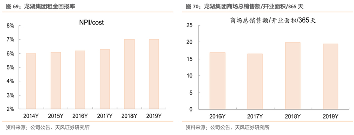 从投资回报率的角度看,龙湖集团NPI/cost在6%-7%的区间内,考虑到近年来龙湖集团新增开业购物中心较多,我们认为这一水平的表现仍可圈可点。以坪效角度看,龙湖集团坪效也基本保持相对稳健的表现。