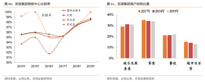从商场出租率角度看,截止2019年末,公司已开业商场整体出租率约98.5%,较上年末略提升1.1pct;合作品牌超4000家,战略合作品牌超230家;其中天街商业出租率98.5%、星悦荟商业出租率98.8%、家悦荟商业出租率100%;天街商业出租率较低的一个原因在于新开业商场中多为天街商业,存在一定的招租招铺时期。从出租率的稳定性看,天街商业整体出租率稳定性较好;星悦荟及家悦荟出租率低点现于2016年,近几年改善效果明显。以租户结构区分看,近几年租户以零售、娱乐服务类为主,分别占比34%、31%,其次为餐饮的占比,约22%的比重,餐饮的比重在近些年内相对稳定;超市及百货的占比最低,且有逐步减少的趋势。