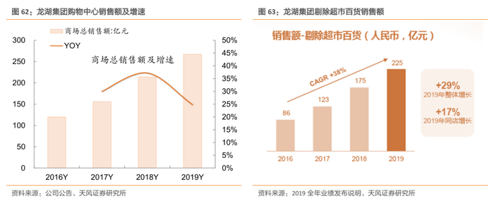 以商场总销售额的表现看,随着开业数量的稳步增加,商场总销售额的增速逐步提升。截止2019年末,公司已实现商场总销售额267亿元,YOY+24.77%;剔除超市百货的销售额为225亿元,YOY+29%,其中同店增长约17%;坪效(商场总销售额/商场开业面积/365天)为19.93元/平米/天,YOY+0.54%。2019年全年总客流4.7亿人次,对应平均日客流为154万人次/天,整体增长23%,其中同店增长9%。