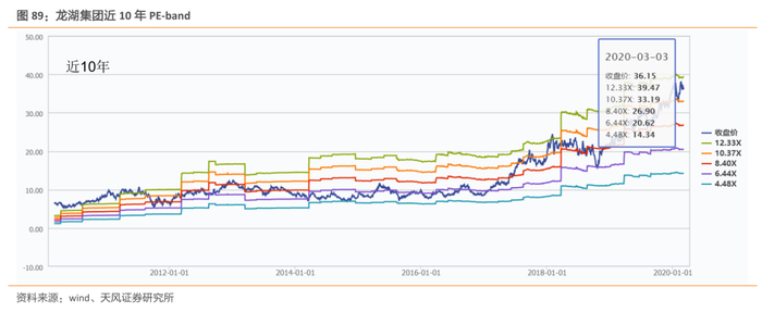通过近3年、近5年、近10年的PE-band的变化,可以发现龙湖集团在自17年启动的这一行情以来,除却业绩的增长带来股价的涨幅,还有一部分在于期间内有较为显著的提估值的变化。