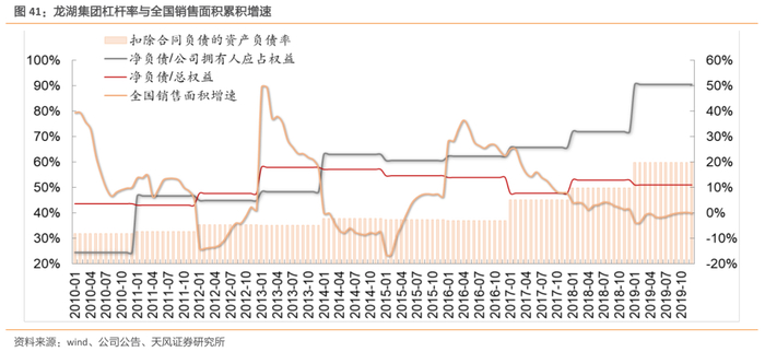 进一步将净负债率、权益净负债率、扣除预收款的资产负债率指标与全国销售面积的累计增速置于同一张图内比较,显而易见的,龙湖集团净负债率水平在三轮地产周期中均较为稳定,而权益净负债率及扣除合同负债的资产负债率则表现为阶段式的提升,且比率提升一般处于销售面积累计增速下行阶段——周期下行期,而在周期上行期,则较好的控制了杠杆率的提升度,与上文所提到的龙湖集团投资能力上的稳扎稳打相呼应,凸显公司较强的择时能力。
