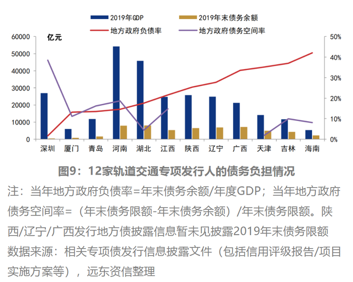 根据Wind资讯和各地专项债发行信息披露数据加工计算,12家发行轨交债的地方政府2019年末负债率为1.6%至42.02%不等,均明显低于国际通行的60%债务率警戒线标准。深圳市2019年末负债率仅1.6%,同时其38.50%的债务空间率(反映没有使用的地方债限额占中央核定地方债限额的比例)也在各发行机构中处于最高,表明深圳市虽轨交债发行规模较高,但地方政府债务杠杆水平较低。2019年末政府负债率相对偏低的还有厦门/青岛/河南/湖北等地,海南省债务杠杆水平相对较高。