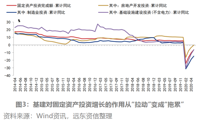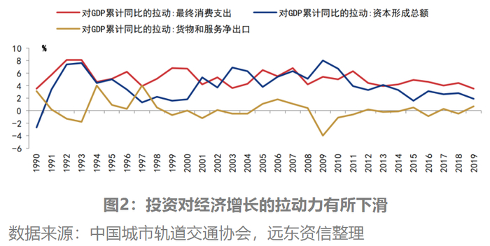 2010年以来,随着国民经济进入新常态,投资增长步伐明显放缓,投资拉动相对消费驱动放缓幅度更大,而出口拉动甚至出现负向拉动局面(见图2)。从投资增长的内部结构来看,基建投资增速放缓对固定资产投资增速造成明显拖累(见图3)。2017年四季度以来,受到紧信用、严监管政策下,PPP清理、资管新规以及地方隐性负债监管趋严等影响,基建投资累计增速呈现断崖式下滑,尤其2018年下半年以来,基建投资增速放缓拖累固定资产增长步伐。而从对比来看,我国基建设施密度与发达国家仍有差距,表明基建投资仍然存在扩张潜力。作为基建投资的一大组成,近年我国轨道交通建设投资相对整个基建投资而言增速较快,如图4所示。但在复杂贸易形势叠加疫情对宏观经济的负面影响下和加快基建补短板的政策大环境驱动下,加之我国城镇化率提升、人口规模稳增,尤其超大城市人口密集、交通状况改善需求推动下,国内城市轨道交通建设投资依然存在持续快速增长的动力。