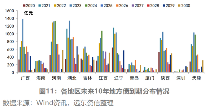 从未来地方债到期金额来看,近10年12家发债主体的地方债到期金额将呈现“冲高走低”趋势,辽宁/河南/湖北/陕西/广西等地区地方债近3年(2020至2022年)到期金额较高。