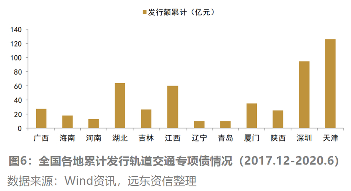 自2017年12月至2020年6月,全国已有12个省级政府发行轨道交通专项债,如图6所示。天津市以累计发行126.1亿元居于全国首位,占全国比重达24.76%;天津目前运营轨道交通线6条、长232公里,运营里程占全国约3.4%。深圳市以累计发行94.5亿元居于全国第二,占全国比重达18.56%;截至2019年末深圳市运营的轨道交通线长283.85公里,占全国约4.21%。全国轨道交通发展较早或运营规模较大的北京、上海、江苏、重庆等地则至今没有发行轨交债,轨道交通投资和运营规模均居全国之首的广东也未发行轨交债(不含深圳)。其中,上海以银团融资模式等破解地铁建设难题,如由国开行、工商银行等银团与申通地铁集团“银企合作”支持地铁建设;北京引入PPP模式等破解地铁建设难题,支持了北京4号线、16号线等多条地铁建设。