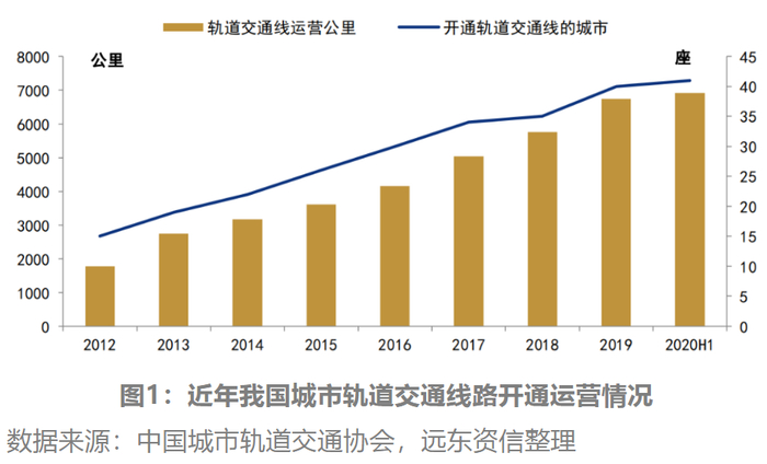 城市轨道交通包含地铁、轻轨、单轨、有轨电车、市域快轨、磁悬浮等多种制式,我国《城市公共交通常用名词术语》将城市轨道交通定义为“通常以电能为动力,采取轮轨运输方式的快速大运量公共交通的总称”。城市轨道交通(以地铁为主)是现代城市交通系统的重要组成部分,是城市公共交通系统的骨干。近年以来,我国城市轨道交通建设维持有序发展,对提升城市公共交通供给质量和效率、缓解城市交通拥堵、引导优化城市空间结构布局、改善城市环境发挥重要作用。根据中国城市轨道交通协会数据,2012年至2019年,我国大陆城市轨道交通运营里程从1777公里增至6736.2公里,年均复合增长20.97%;开通轨道交通线路的城市从15座扩至40座,平均每年新增近4座。