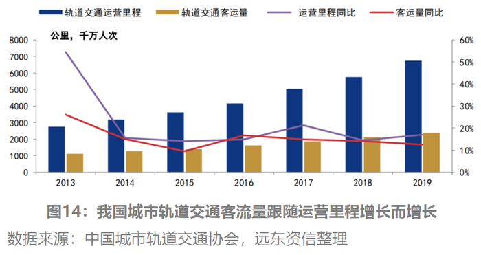 从轨道交通运营风险点来看,其与线路运营性能稳定性、客流预期和现实落差、征地拆迁障碍等因素有关。目前我国地铁施工技术、装备制造逐步实现了国产化,技术先进性居于世界前列,能为地铁运营性能的稳定提供有效保障。从实践经验看,2019年我国城市轨交列车平均5分钟以上延误率0.346次/百万车公里、平均退出正线运营故障率0.022次/万车公里。客流因素则取决于人口、经济和社会环境等因素。从现实来看,我国有轨交运营的城市普遍人口吸附力强,近年随着地铁运营里程增长和宏观经济高质量增长,城市地铁客流量规模也实现了9.5%以上持续较快增长,由于新增轨交运营强度相对偏弱等原因,轨交客流增速通常略低于地铁运营里程增速。