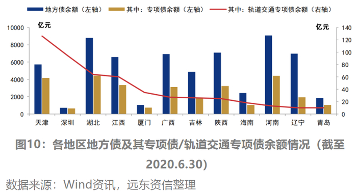 根据Wind资讯提供数据,截至2020年6月底,有轨交债余额的12家地方政府债券余额分布以河南/湖北/陕西/辽宁/广西等地相对居多,海南以及青岛/厦门/深圳等计划单列市较低;专项债余额则以湖北/河南/天津/江西等地居多,海南以及青岛/厦门/深圳等地较低;轨交债余额则以天津/深圳/湖北/江西/厦门等地居多。
