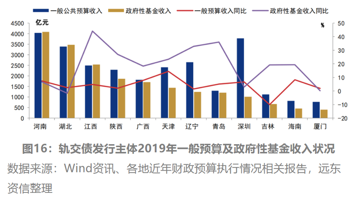 财政实力是支撑地方政府推进轨交项目建设和偿还债券本息、实现项目收支平衡的一大重要保障,具体从12家轨交债发行主体财政状况来看,根据Wind资讯提供数据,2019年河南/深圳/湖北/辽宁等地一般公共预算收入相对靠前,而河南/湖北/江西/陕西等地政府性基金收入相对靠前。