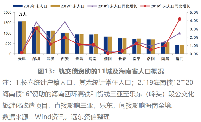 轨道交通运营收入主要包括车站票务收入以及地铁商业(如地铁站厅内商业、换乘通道商业等,有别于地铁上盖商业)、通信、站内和车厢广告等非票务收入。作为运营收入核心,票务收入与票价、人口因素以及当地经济状况、居民收入、其他交通方式的竞争力等有关。其中:(1)票价因素方面,据中国城市轨道交通协会采编资料,城市轨道交通票计价实行区间分段(如哈尔滨)、里程分段(绝大部分城市)或两者并存(如天津、大连),按里程分段、递远递减现象较普遍(图13中的武汉、南昌、青岛、南宁、洛阳、深圳等众多城市按此方式计价)。总体上,各城市地铁票价较为稳定、稳中有增。(2)人口因素方面,我国地铁/轻轨申报城市人口门槛为300万人/150万人,轨交债资助城市中,2019年末常住(或户籍)人口有天津、深圳、武汉、西安4座超千万,青岛、沈阳、长春、南宁、洛阳超500万,最低厦门426万,这些城市人口规模庞大且平稳增长(见图13),普遍具有较强人口吸附力。至于“19海南债12”“20海南债16”资助的三亚至岭头公交化旅游化改造项目,直接惠及三亚市、乐东自治县。三亚市2019年末常住人口74.19万人,其中户籍人口(63.44万人)同比增长3.11%。(注:该项目将建成三亚至乐东岭头段公交化旅游化列车,不属于地铁/轻轨,不适用地铁/轻轨申报门槛标准)