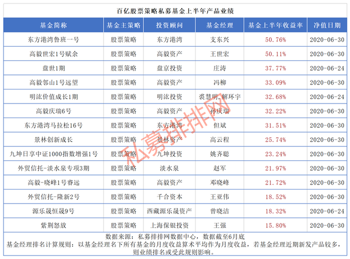从知名百亿私募机构旗下单只股票策略基金收益表现来看,有两只基金产品上半年收益超过50%,分别由东方港湾支东兴、高毅资产王世宏担任基金经理。虽然管理基金规模庞大,冯柳也是再次斩获骄人业绩,截至6月30日,由冯柳担任基金经理的“高毅邻山1号远望”上半年收益33.09%。