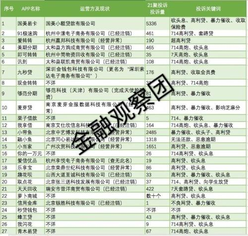 根据央视曝光的APP名单,两个表格共有53个APP(见附表2,“爱转转”出现两次)。金融观察团进行了调查整理(见附表1),发现至少有42个为现金贷平台,占比79%。这其中,除了无法获取信息的个别平台,21聚投诉等网站上涉及 “714”投诉关键词的平台高达22个,占比过半。