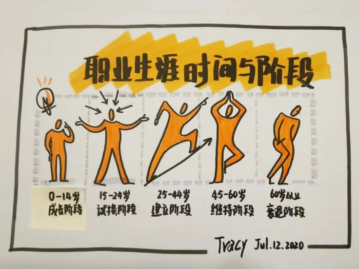 1953年,美国职业生涯规划教育大师舒伯把自己的个人职业发展,通过自制“生涯彩虹图”展现出来。他将时间轴分为5个阶段: