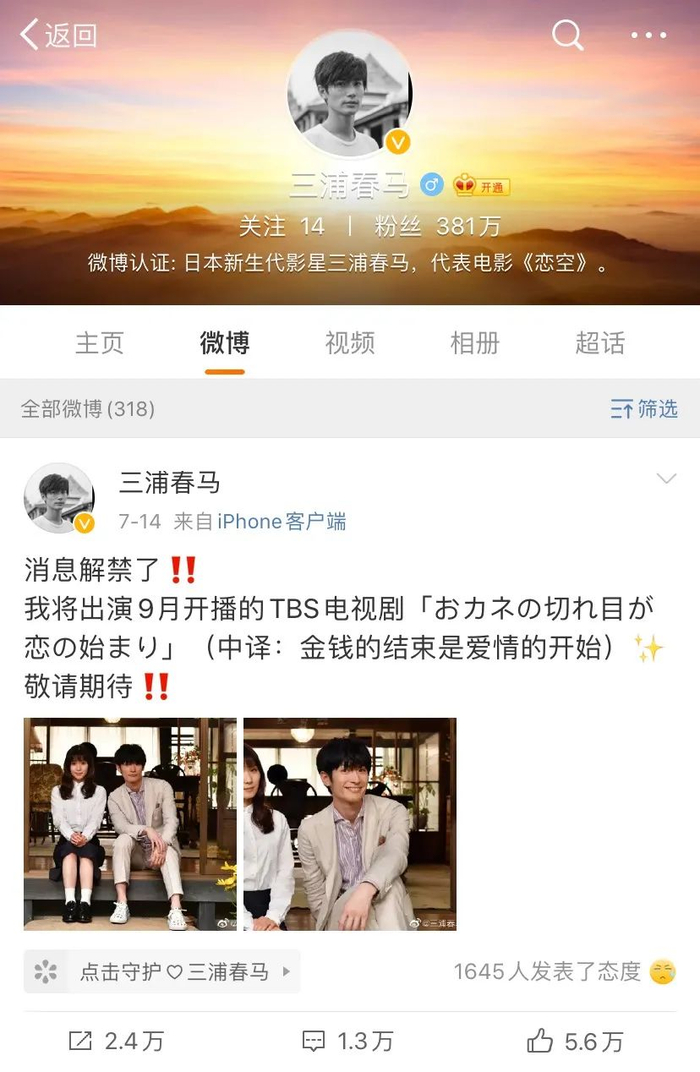 7月14日,三浦春马曾在微博发文称,自己将出演TBS新剧《钱断情起》(又名《金钱的结束是恋情的开始》,おカネの切れ目が恋の始まり),希望观众期待。该剧由他和松冈茉优、三浦翔平、北村匠海主演,定档九月每周二晚10点开播。
