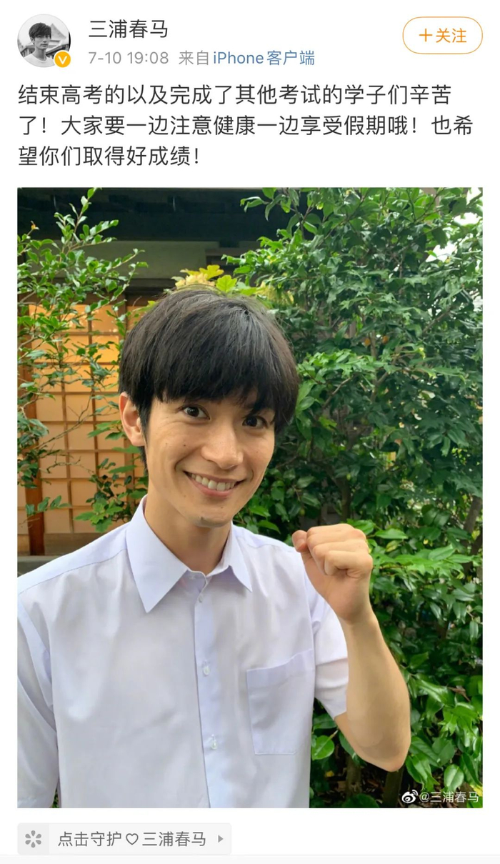 7月10日,他还在微博鼓励高考学子:“结束高考的以及完成了其他考试的学子们辛苦了!大家要一边注意健康一边享受假期哦!也希望你们取得好成绩!”并附上了甜甜的笑容照。