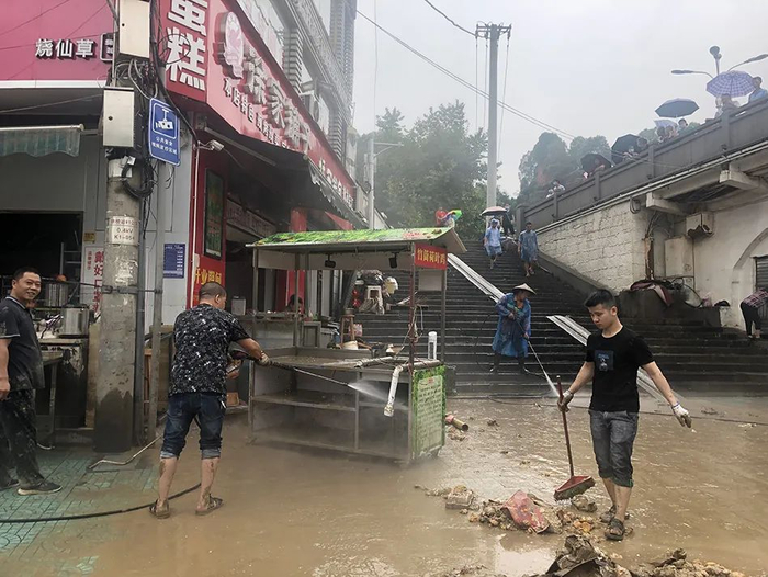 “也就是10分钟的时间,水就漫过河堤,涨到路面上来了。”陈女士回忆,水涨得太快,她在二街做了十几年的生意,以前还没见过把店铺都淹了的情况。当晚,她因担心店内物品,只睡了两三个小时。18日上午,陈女士叫来几个亲戚朋友,帮她清理店铺。