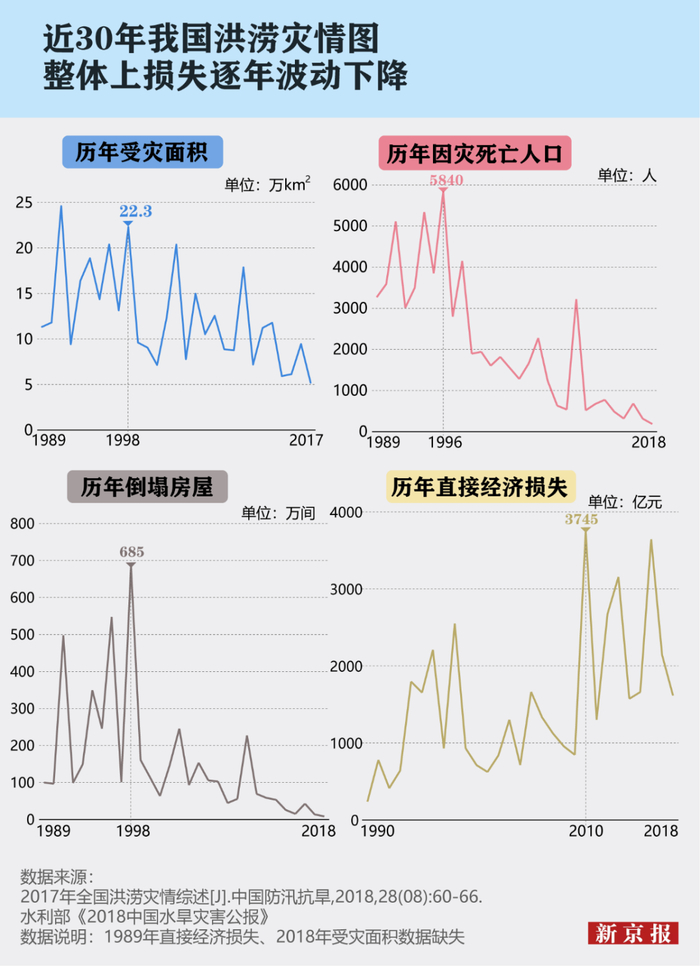 近30年间,我国洪涝灾害引发的受灾面积、死亡人口数量、倒塌房屋数量都呈波动下降趋势。其中,历年因灾死亡人口和倒塌房屋数量明显大幅下降。而随着经济发展,总体上洪灾带来的直接经济损失呈波动上升趋势。
