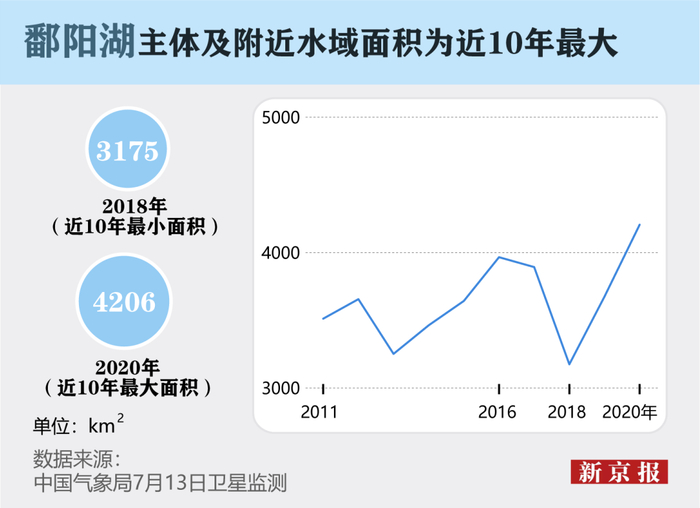 据中国气象局7月13日消息,卫星监测显示,鄱阳湖主体及附近水域面积达4206平方公里,为近10年最大,受持续强降水和上游来水共同影响,鄱阳湖主体及附近水域面积迅速增大。