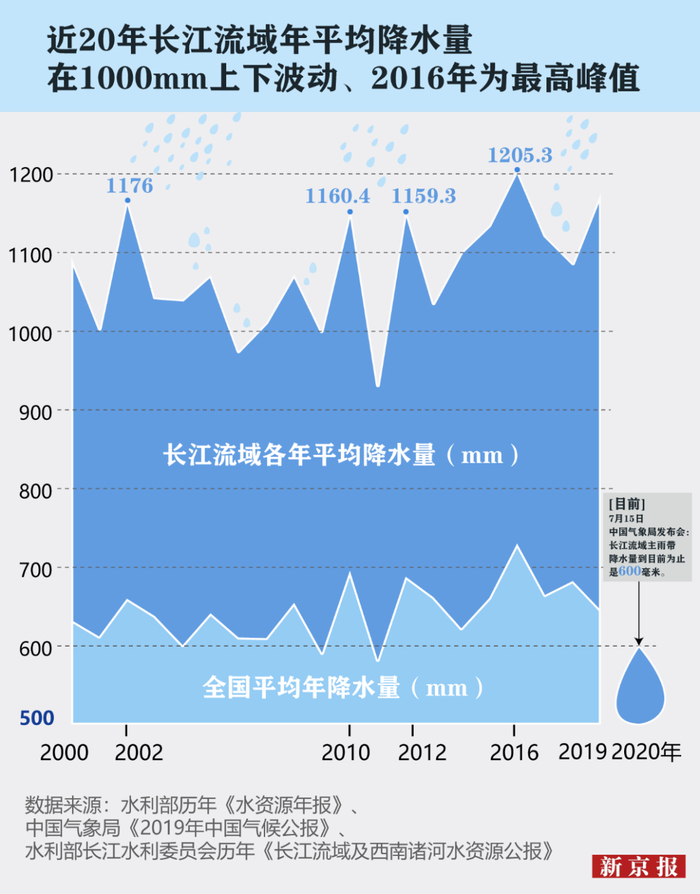 长江流域年平均降水量的变化趋势基本上与全国保持同步,但降水量常年大于全国水平,2016年,长江流域平均降水量达到峰值1205.3毫米。