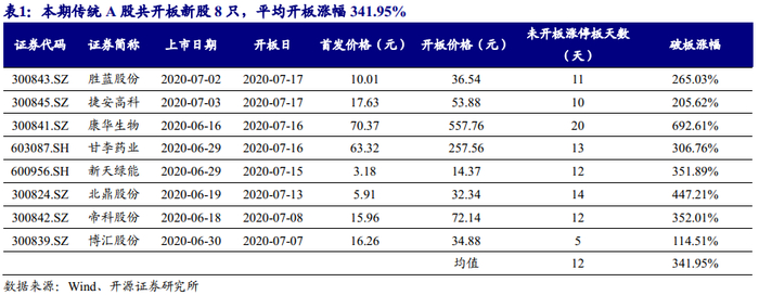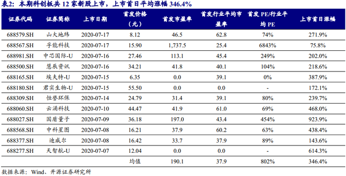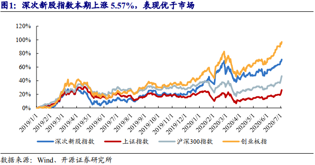 本期(2020年7月6日至7月17日,下同)深证次新股指数上涨5.57%,表现优于于上证指数(1.94%)、沪深300指数(2.83%),弱于创业板指(8.12%)。新股开板涨幅方面,本期传统A股共开板新股8只,平均开板涨幅341.95%,高于上期124.82%的平均开板涨幅。本期科创板共有12家公司上市,上市首日平均涨幅346.4%。