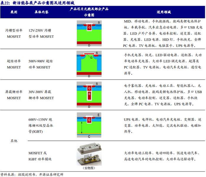 公司产品系列丰富,满足不同客户的差异化需求。公司主要产品为沟槽型功率MOSFET、超结功率MOSFET、屏蔽栅功率MOSFET和IGBT等半导体功率器件,已拥有覆盖12V~1350V电压范围、0.3A~300A电流范围的多系列细分型号产品,是国内领先的半导体功率器件行业中MOSFET产品系列最齐全的设计企业之一。公司通过构建主要产品工艺技术平台,衍生开发细分型号产品,并持续升级产品工艺平台,形成了“构建-衍生-升级”的良性发展模式,从而使得公司细分型号产品能够快速、“裂变式”产生,满足下游多个领域的需求,最终引致公司经营规模迅速增长。截至目前,公司已拥有1,000余种细分型号产品,能够满足不同下游市场客户以及同一下游市场不同客户的差异化需求。基于国际先进的超低能耗电荷平衡理论技术,公司研发的主要产品紧跟国际一线品牌,且拥有全部自主知识产权。公司600V-1350V的沟槽型场截止IGBT、500V-900V的第三代超结功率MOSFET、30V-300V的屏蔽栅功率MOSFET、12V-250V的沟槽型功率MOSFET均已实现量产及系列化。