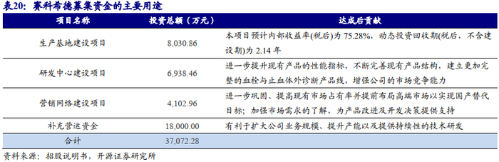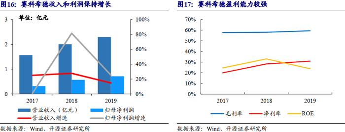 公司2017、2018、2019年营业收入分别为1.6、2.0、2.3亿元,CAGR为21.0%,对应归母净利润分别为0.3、0.6、0.7亿元,CAGR为50.8%。公司2019年营收增长的主要原因系体外诊断市场快速发展以及分级诊疗助力国产血栓与止血体外诊断品牌的发展。2017至2019年,公司毛利率分别为57.8%、58.0%、59.4%,净利率分别为19.9%、28.3%、30.9%,ROE分别为24.5%、33.0%、23.8%。